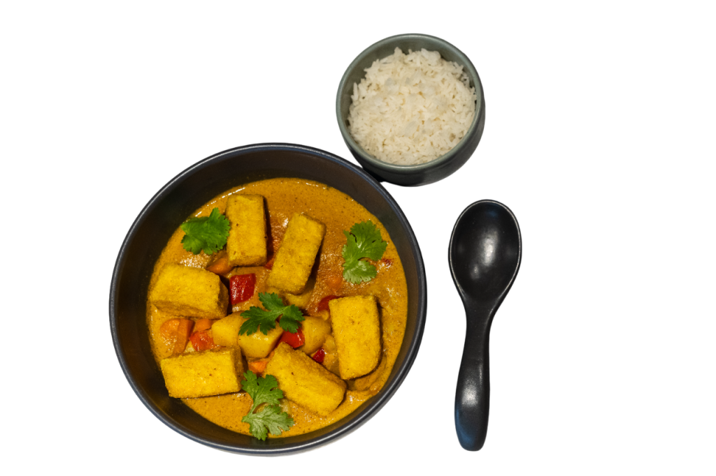 Caril amarelo tailandês à base de leite de coco e especiarias com batata, couve-flor, cenoura, pimento vermelho e tofu crocante. Acompanha com arroz jasmim