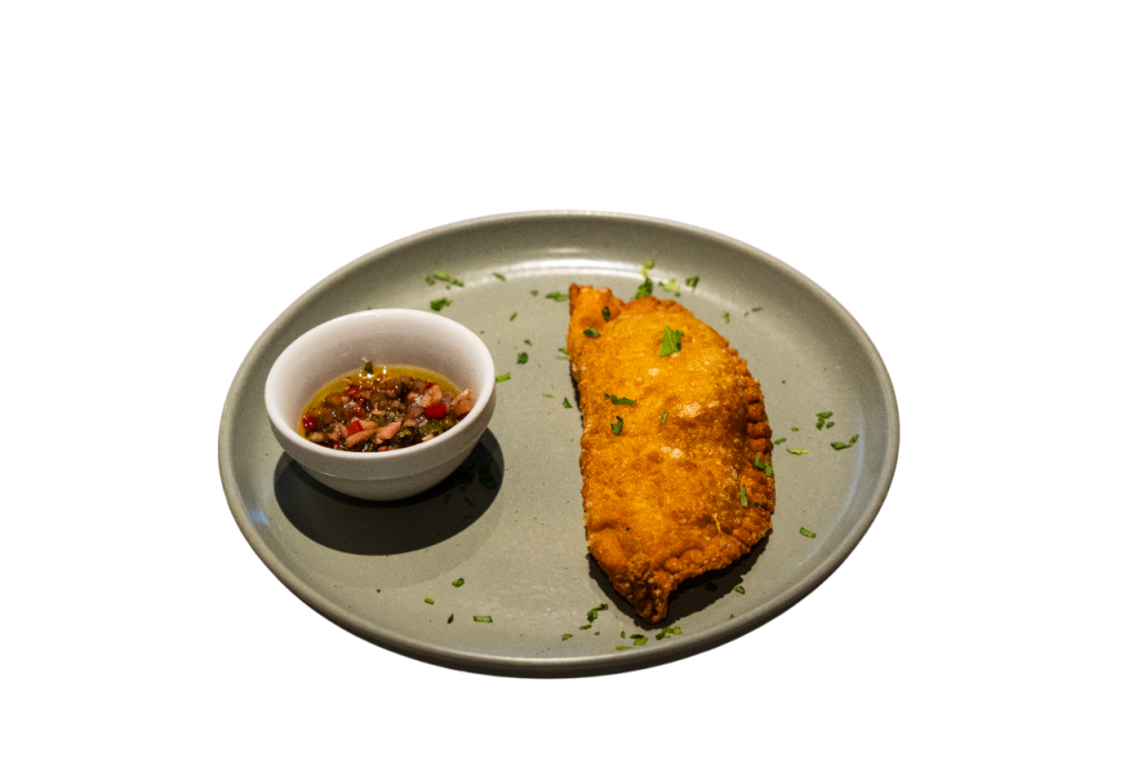 Pastel de massa tenra recheado com “carne” picada, batata e queijo vegan, acompanhado de molho chimichurri