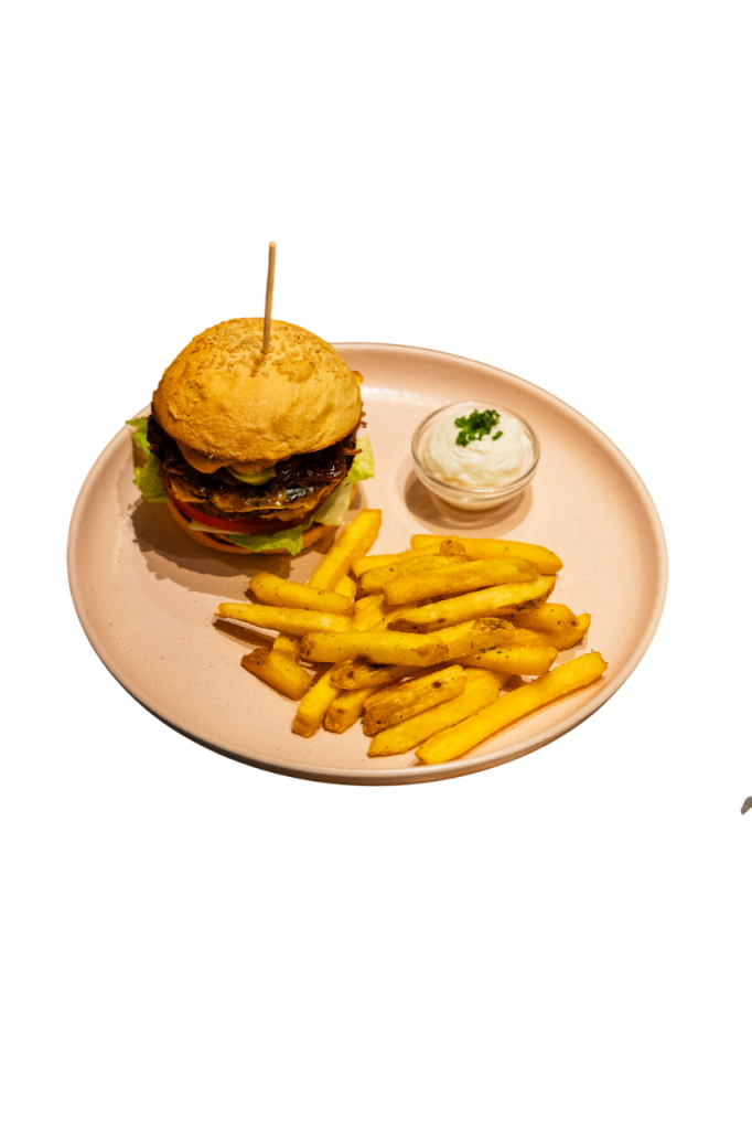Pão de forma, lascas de seitan, salsicha beyond meat, cogumelos portobello, tomate, queijo e molho de francesinha da casa. Acompanha com batatas fritas. (Adicionar “ovo” estrelado por mais 3€)