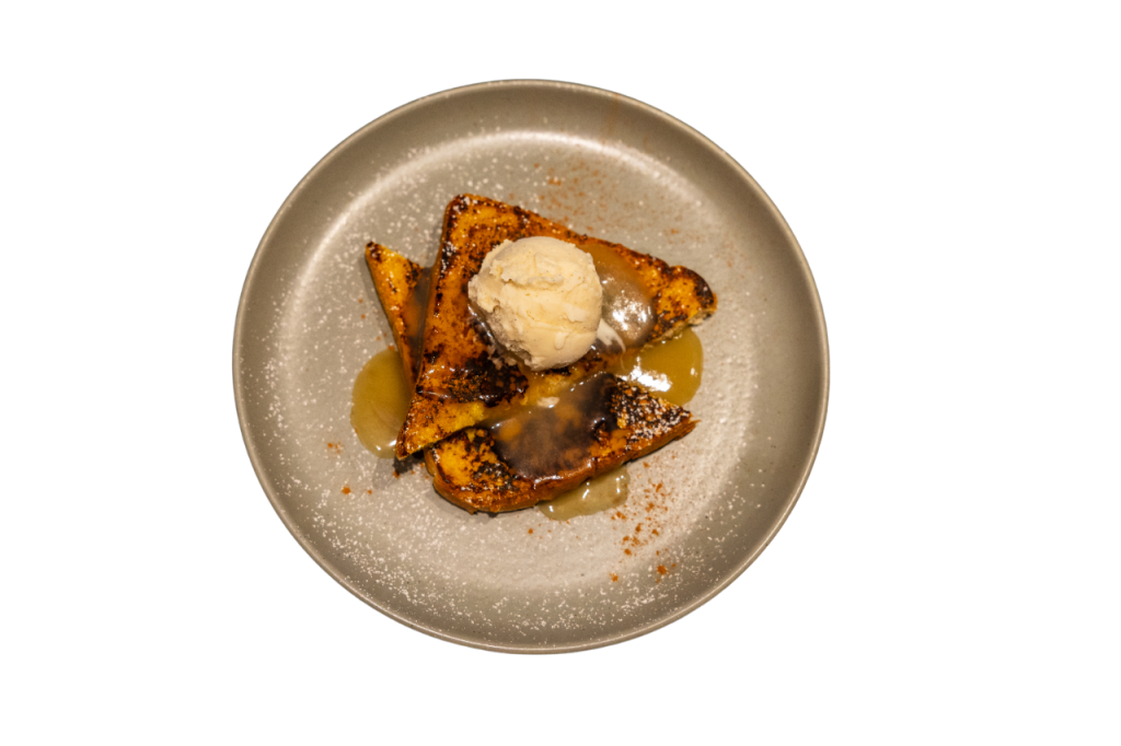 Rabanada de brioche de fermentação lenta, doce de leite de coco, canela, raspa de laranja e gelado de baunilha artesanal
