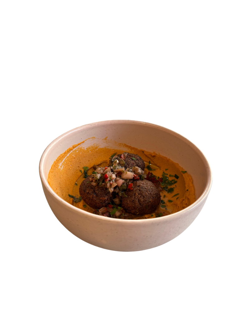 Hummus de pimento vermelho assado, falafel e molho chimichurri